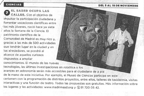 Fecha 02/11/2007 Fuente El Mundo - METROPOLI El saber ocupa las calles Con el objetivo de impulsar la participación ciudadana y fomentar vocaciones científicas entre los más jóvenes, nació hace ya siete años la Semana de la Ciencia. Descargar dossier Add new comment