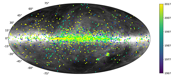 El censo de púlsares después de 50 años de búsqueda desde el radio. Los diferentes colores representan la fecha de descubrimiento. /S. Serrano Elorduy y N. Rea (CSIC)