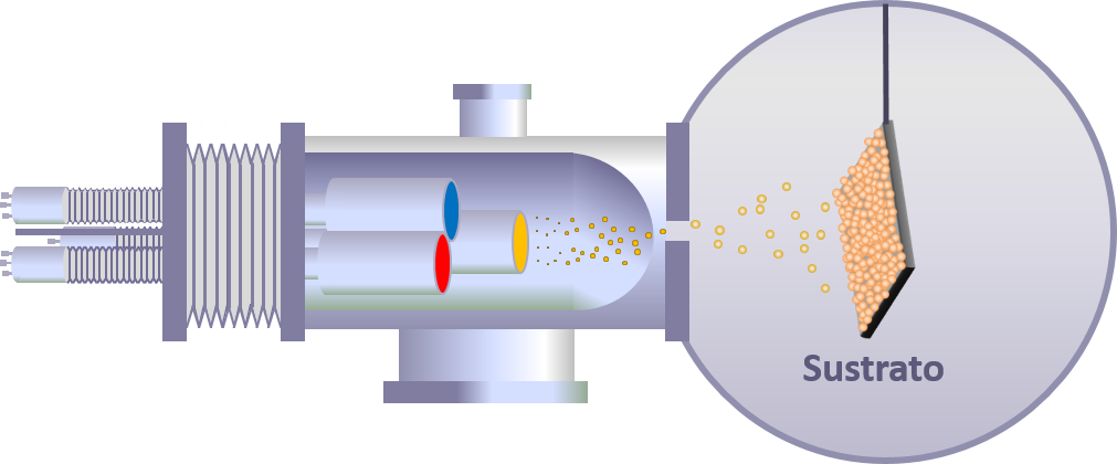 Sin embargo, la tecnología de Nanostine es un método físico de síntesis, por lo que todas las limitaciones mencionadas anteriormente se pueden mitigar. Usamos un equipo de producción que contiene distintos magnetrones en una cámara de agregación (imagen 1), que van formando las nanopartículas por sputtering. Luego, las nanopartículas se depositan en una superficie que se encuentra en una cámara de ultra alto vacío (UAV).