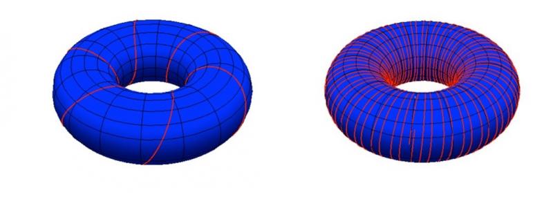 Figura 1: Las trayectorias regulares se mueven siempre sobre los toros invariantes, unas superficies que en sistemas con dos dimensiones tienen forma de rosquilla, pudiendo cubrirlos densamente (si la trayectoria es cuasiperiódica) o no (si la trayectoria es periódica, en cuyo caso se ve como una línea que se cierra sobre sí misma). Fuente: Fabio Revuelta (UPM)