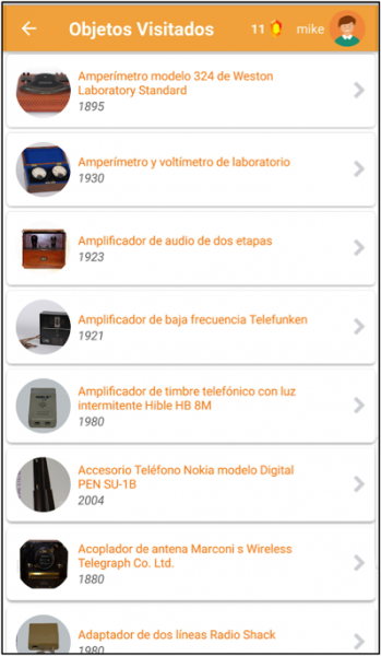 Capturas de pantalla de la aplicación de gamificación diseñada para el museo de telecomunicación. A la izquierda, se muestra un ejemplo de pregunta generada. A la derecha, se presenta el historial de los objetos visitados por un usuario. Fuente: elaboración propia.