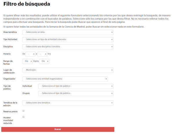 La web www.madrimasd.org/semanacienciaeinnovacion/actividades ofrece la información de una forma práctica, a través de un buscador en el que se pueden introducir distintos criterios: área temática, tipo de actividad, disciplina, horario, rango de fechas, lugar de celebración, institución organizadora, tipo de público, si es necesario hacer reserva previa o si es accesible para personas con movilidad reducida.