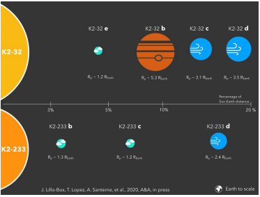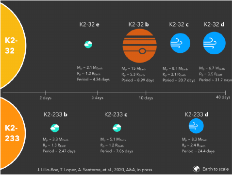 Figura 2. Representación artística de los sistemas planetarios K2-32 y K2-233 donde aparecen las masas, radios y periodos de los planetas. Crédito: Jorge Lillo Box, T López, A. Saterne, et al.