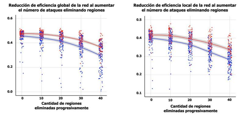 Los puntos rojos representan a los individuos de alta capacidad intelectual, mientras que los azules representan a los de capacidad promedio. Se observa cómo va disminuyendo la eficiencia global (izquierda) y local (derecha) de la red a medida que se va eliminando progresivamente el número de regiones (desde 0 hasta 40) entre las que se establecen conexiones en la red cerebral. La diferencia que separa a los individuos de alta y moderada capacidad va aumentando con la acumulación de “ataques” a su red de conexiones cerebrales / UAM