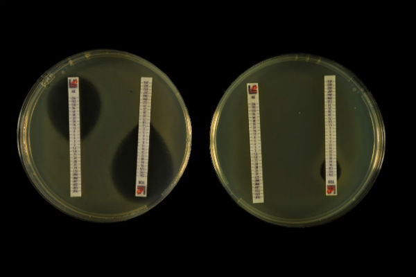 En la foto se muestra la inhibición del crecimiento bacteriano que producen los antibióticos. El tamaño de los halos indica si una bacteria es sensible o resistente. Izquierda, sensible; derecha, resistente. Imagen de Inés Poveda, Centro Nacional Biotecnología (CNB-CSIC).