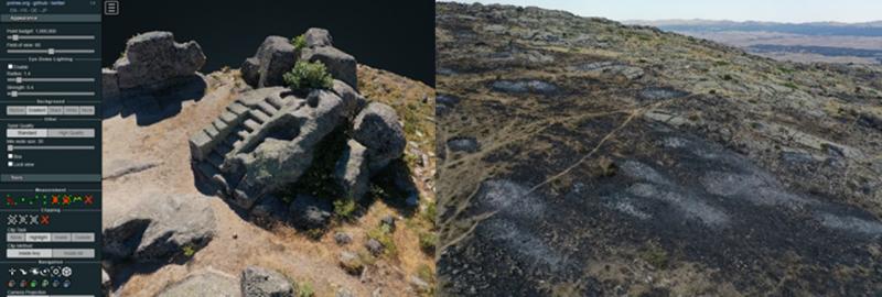 A la izquierda, nube de puntos 3D del Altar de Ulaca (Fuente UPM). A la derecha, foto del castro de Ulaca tras el incendio de Navalacruz (Fuente UCM)